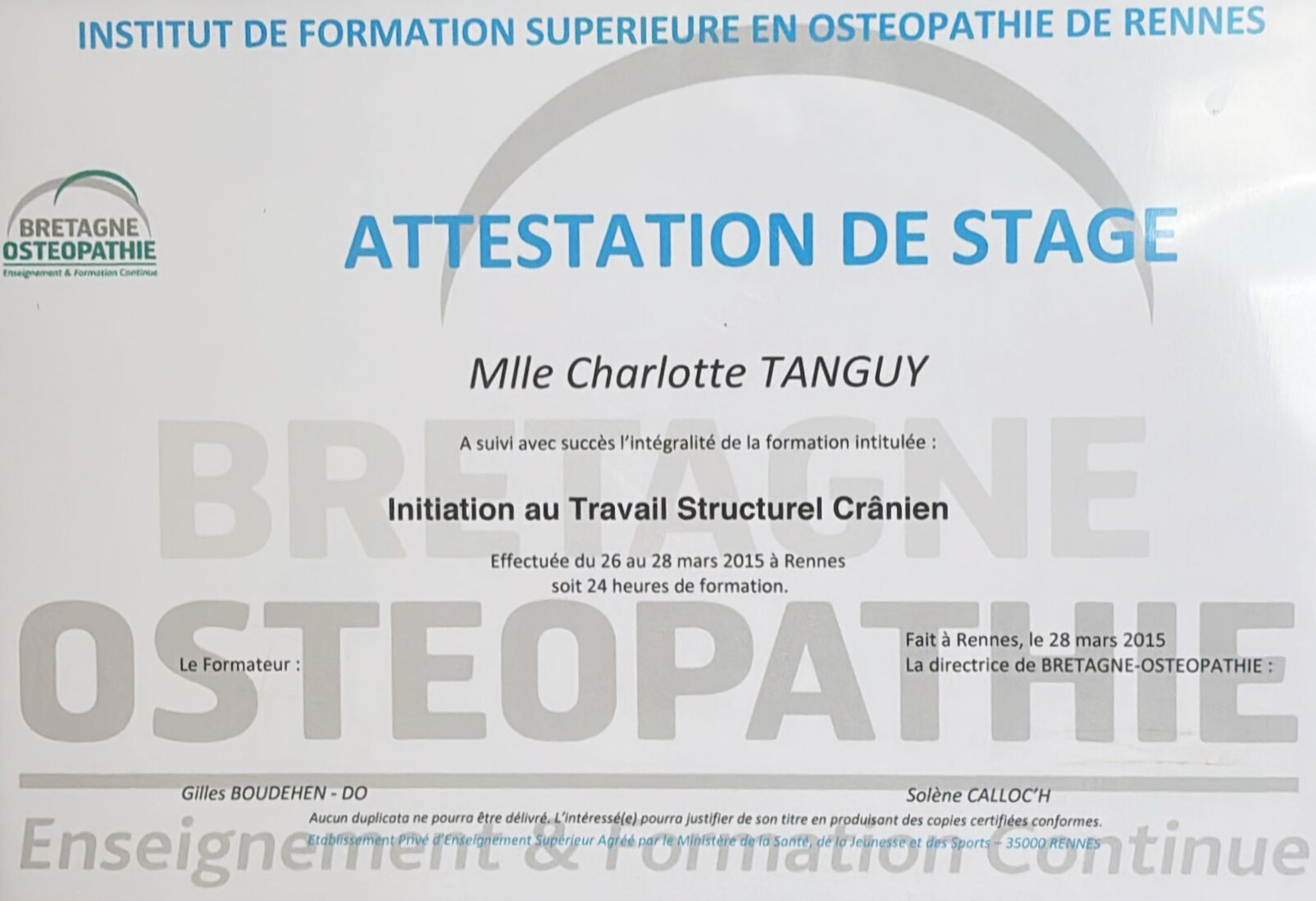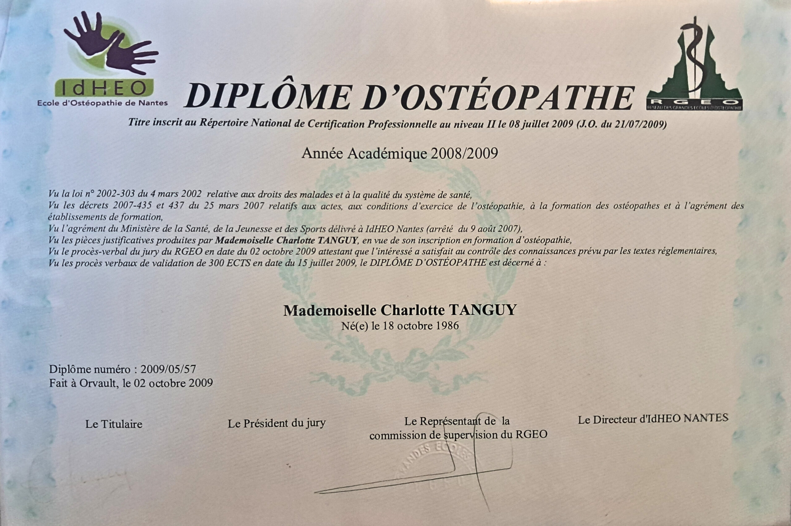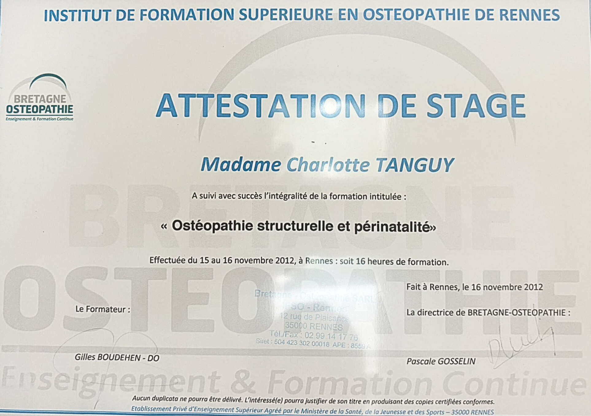 - Diplôme d’ostéopathie à l’Institut des Hautes Études Ostéopathiques (IDHEO) NANTES ET Validation de mon mémoire sur la prise en charge ostéopathique précoce du nourrisson présentant une plagiocéphalie positionnelle postérieure (tête plate)