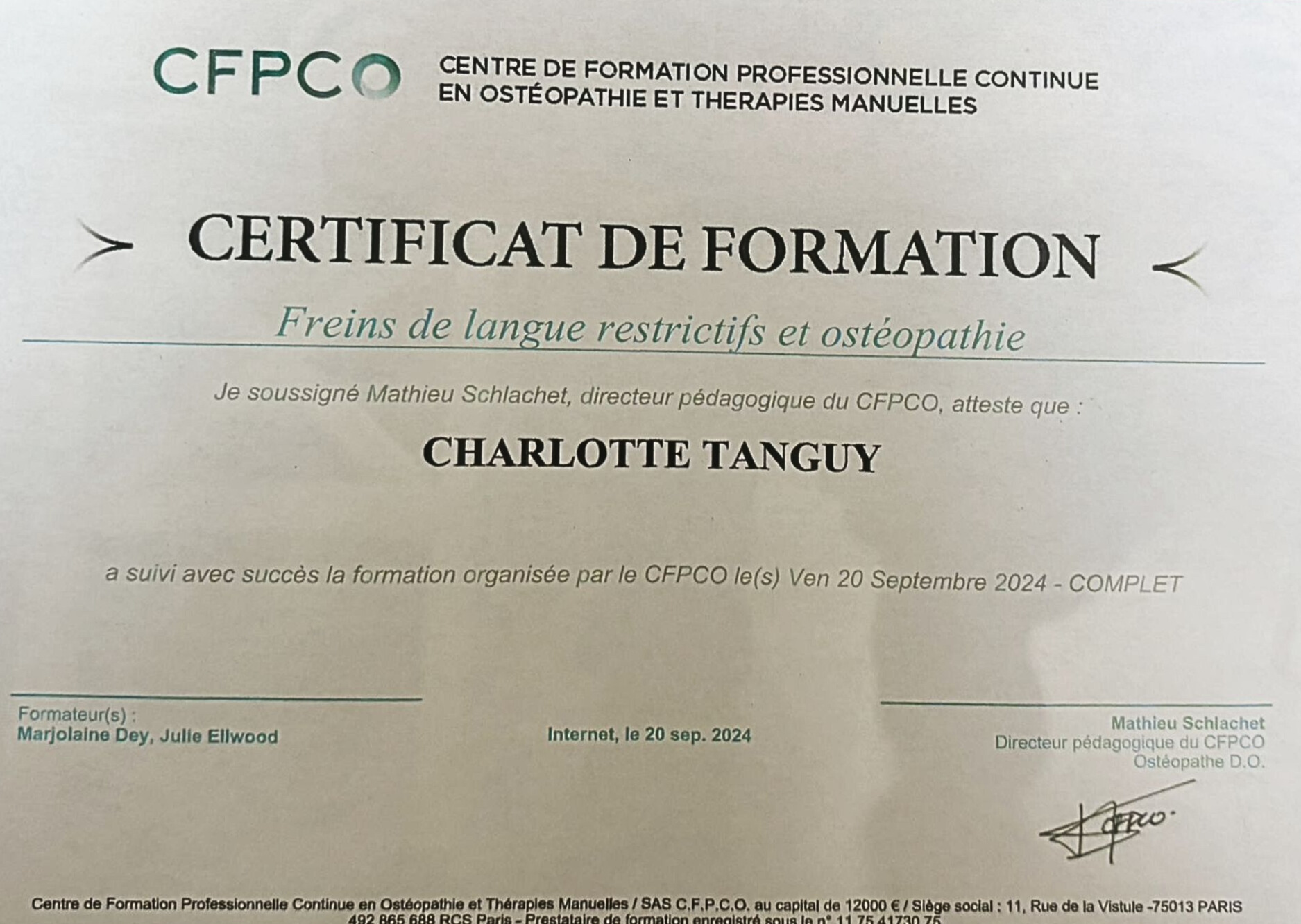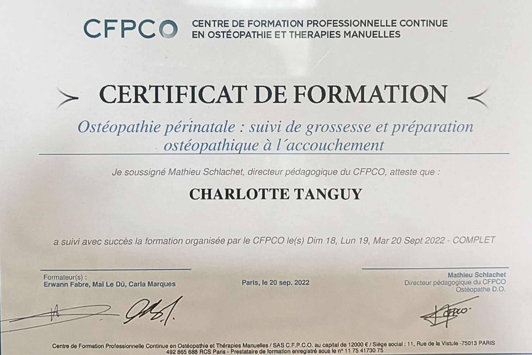 - Formation Ostéopathie Périnatale et Pédiatrique (OPP) Paris de Roselyne Lalauze-Pol délivrant un certificat d’ aptitude à la pratique d’ ostéopathie périnatale et pédiatrique